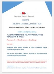 L’associazione Giustizia e Democrazia (Aged) organizza, per giovedì 4 luglio, un incontro di diritto e procedura penale dal titolo “Le caratteristiche del rito accusatorio realizzato in Italia”.