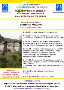 Dopo una breve presentazione dell’Associazione da parte del presidente AIFA Lombardia APS – associazione italiana famiglie ADHD Astrid Gollner, sarà effettuata un’ampia panoramica sull’ADHD a cura di Davide Villani, Neuropsichiatra dell’UONPIA di Lecco.